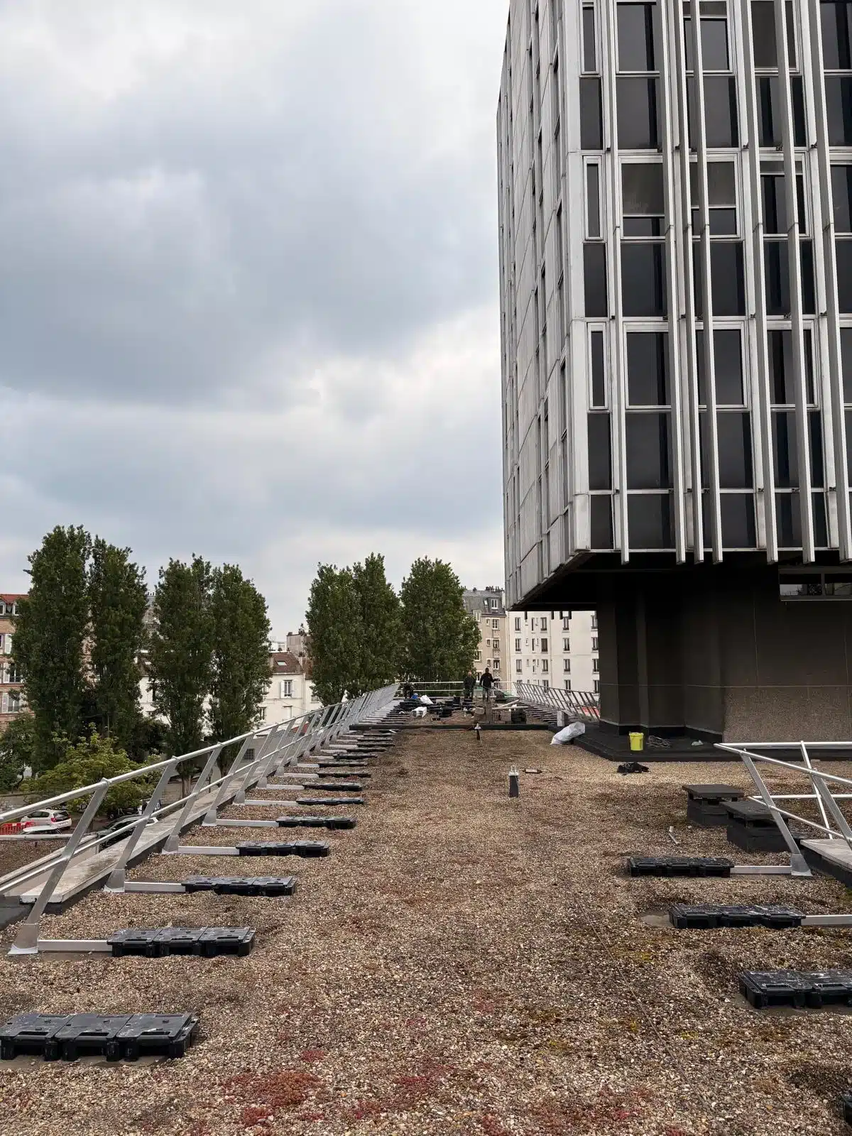 Oui, mais la solution varie selon vos contraintes. Nos équipes conçoivent des interfaces spécifiques pour chaque configuration : toitures-terrasses avec étanchéité sensible (autoportant), zones industrielles avec possibilité de scellement (fixation permanente par sabots), bâtiments avec acrotères ou murets périphériques (applique).